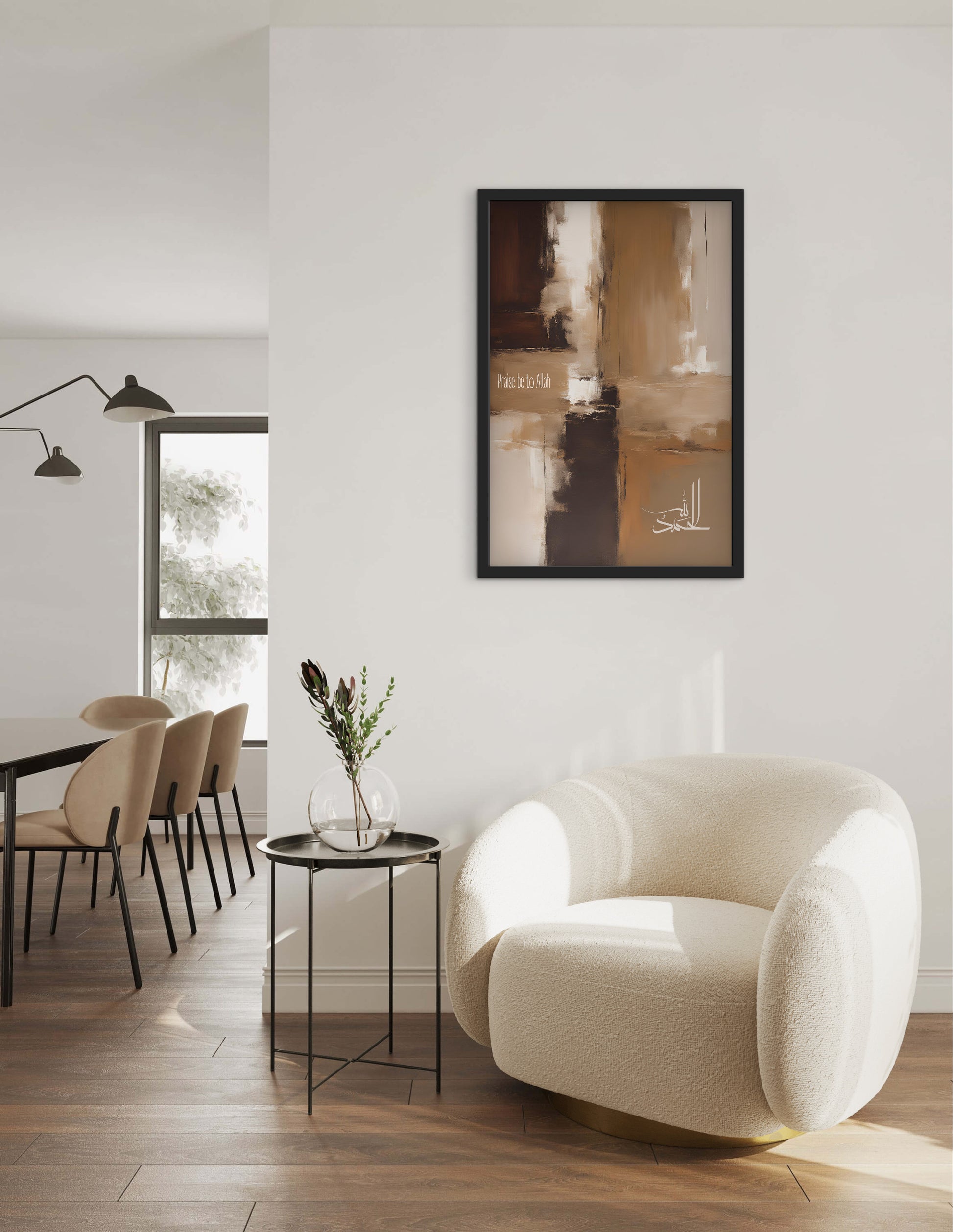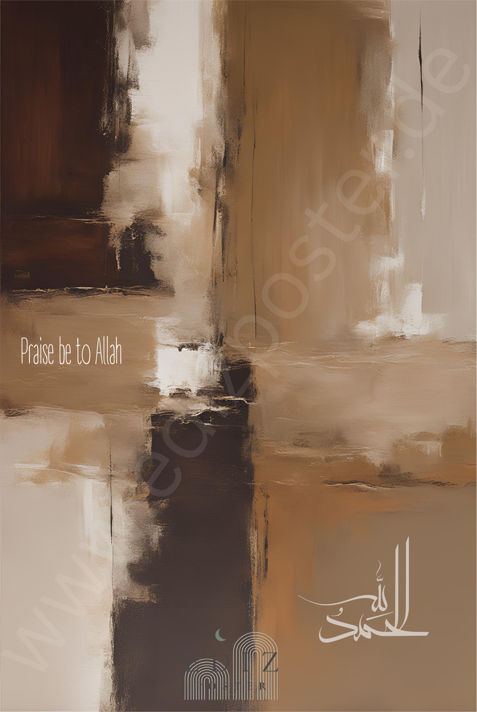 Dieses Kunstposter zeigt den Dhikr „Alhamdulillah“ in eleganter arabischer Kalligrafie, zentriert auf einem kunstvoll gestalteten Acrylgemälde in warmen Brauntönen. Die vielschichtig aufgetragenen Farben und feinen Strukturen verleihen dem Werk Tiefe, Wärme und eine meditative Ausstrahlung.