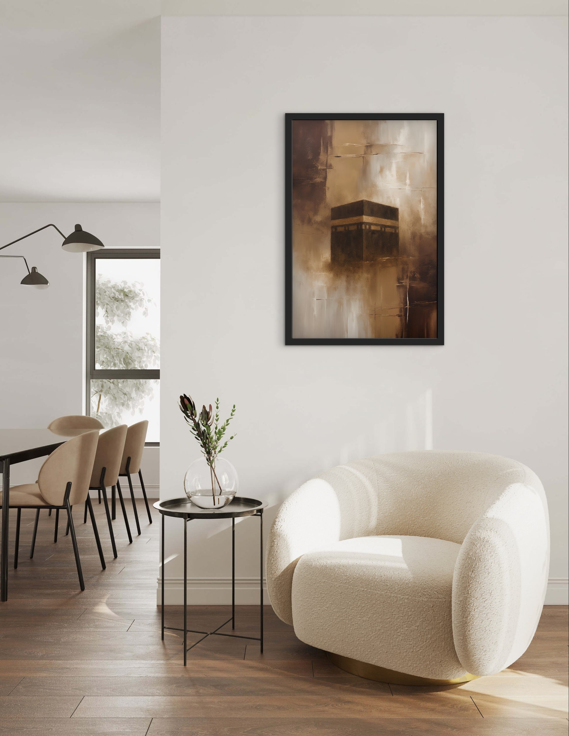 Dieses Kunstposter zeigt die Kaaba in einer minimalistischen, kraftvollen Darstellung, eingebettet in ein abstraktes Acrylgemälde in warmen Braun- und Erdtönen. Die frei verstrichenen Pinselbewegungen und sanften Farbverläufe verleihen dem Werk Tiefe, Wärme und eine ruhige, emotionale Präsenz.