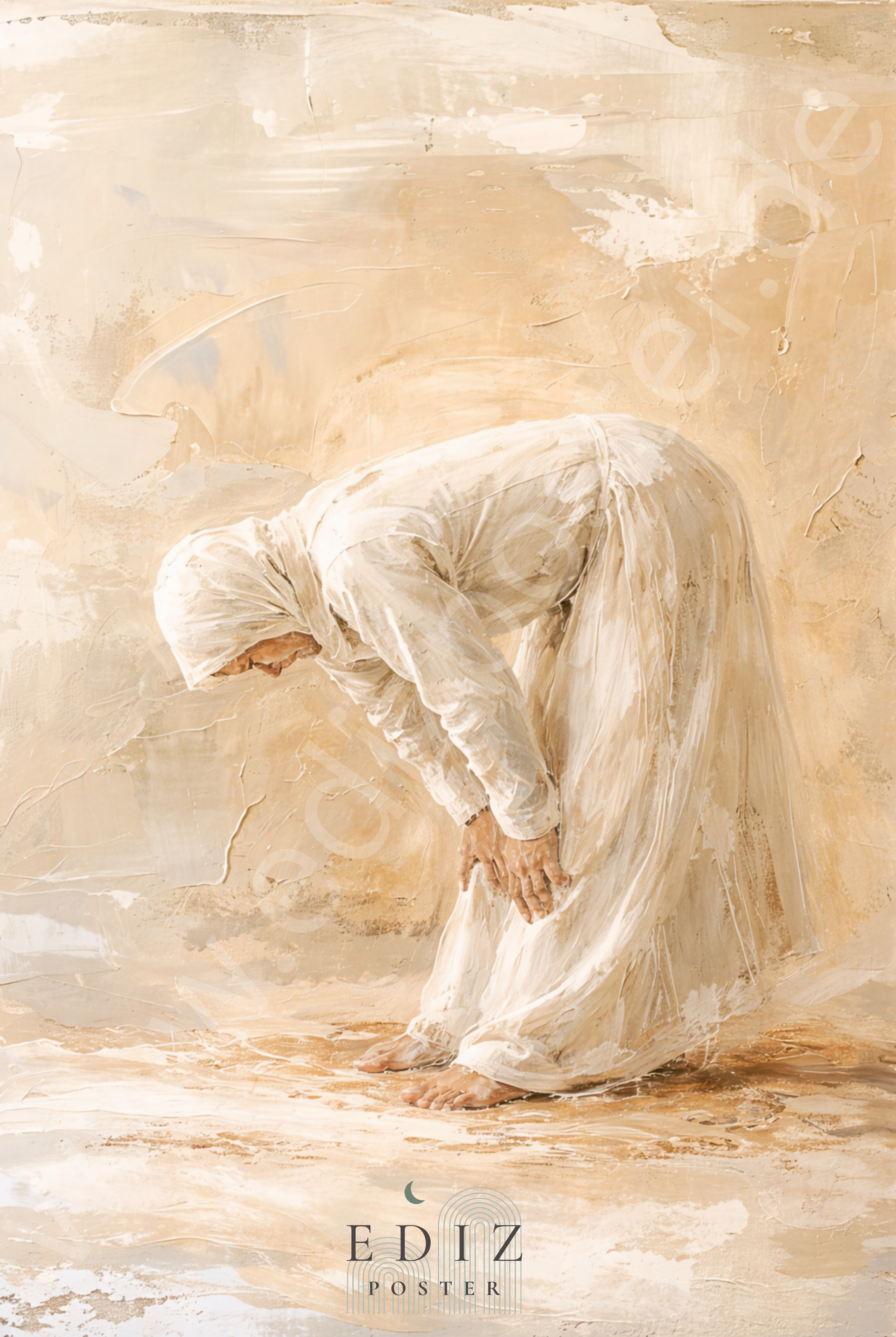 Das Kunstposter „Ruku - Moment der Ehrfurcht“ verbindet tiefe Spiritualität mit moderner, minimalistischer Ästhetik. Es zeigt die Gebetshaltung Ruku, den Moment der Verbeugung im Gebet, dargestellt in sanften, sanften Creme- und Beigetönen. Die reduzierte Gestaltung lenkt den Blick auf die Bedeutung und vermitteln Frieden, Demut und spirituelle Nähe zu Allah.